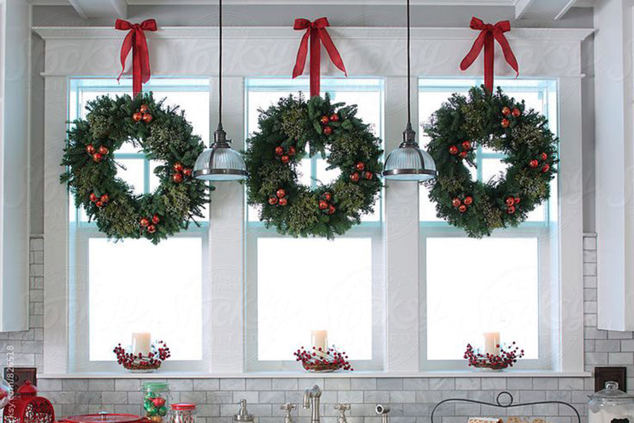 Với căn phòng có nhiều cửa sổ hoặc diện tích cửa sổ lớn, bạn có thể treo vòng nguyệt quế thành hàng để tạo sự hài hòa và cân đối. Vòng nguyệt quế thường có lá xanh, vì vậy, bạn hãy tạo điểm nhấn bằng những chiếc nơ đỏ nhé!
