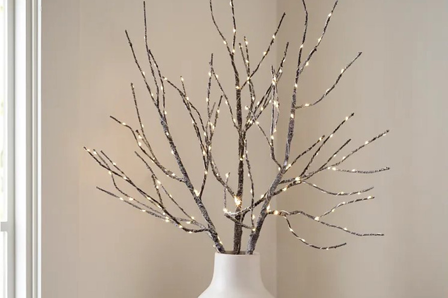Cắm cành thông khô vào bình như một lọ hoa và kết hợp thêm đèn led là một ý tưởng trang trí Noel thú vị.