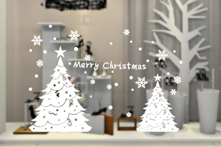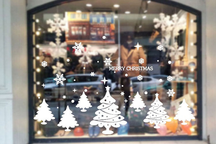Mẫu decal cây thông, bông tuyết lấp lánh và lời chúc Giáng Sinh sẽ rất phù hợp với phong cách decor đơn giản.