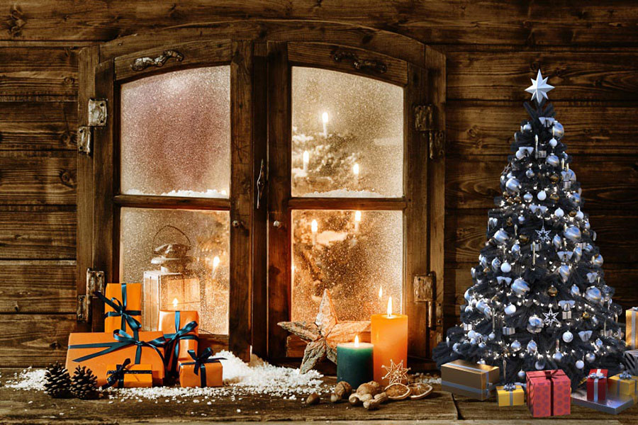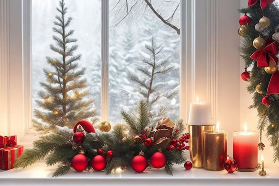 Bạn có thể trang trí cửa sổ bằng cách đặt bên cửa sổ những đồ vật đặc của mùa Noel như cây thông nhỏ, quả châu màu sắc và những hộp quà.