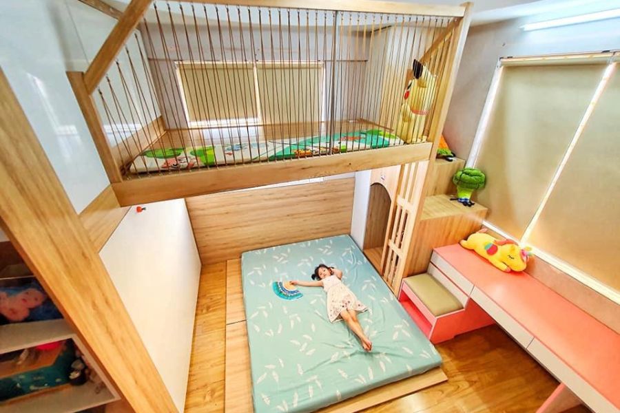 - Sử dụng gác lửng để tạo ra khu vực chơi riêng cho trẻ. Bạn có thể đặt một chiếc bàn nhỏ, một góc sách hay một cái lều dễ thương.