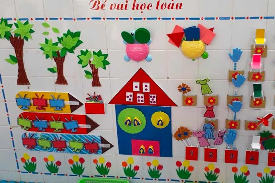 Ở đa số các trường mầm non hiện nay, mẫu trang trí theo hình cắt dán với những con số hay bức hình liên quan đến toán học đang ngày càng phổ biến. Ý tưởng này dễ thực hiện và có nhiều tính ứng dụng, do đó nhiều thầy cô chọn mẫu trang trí này.