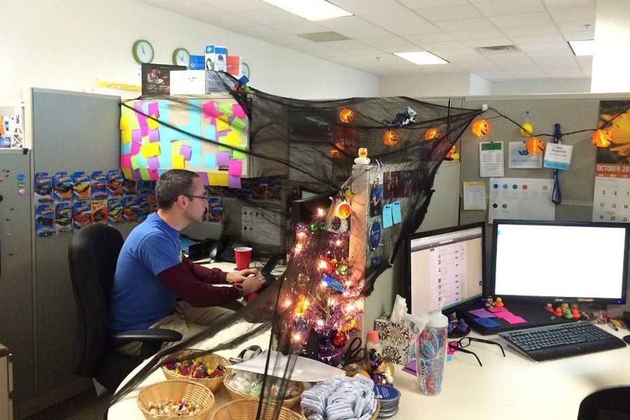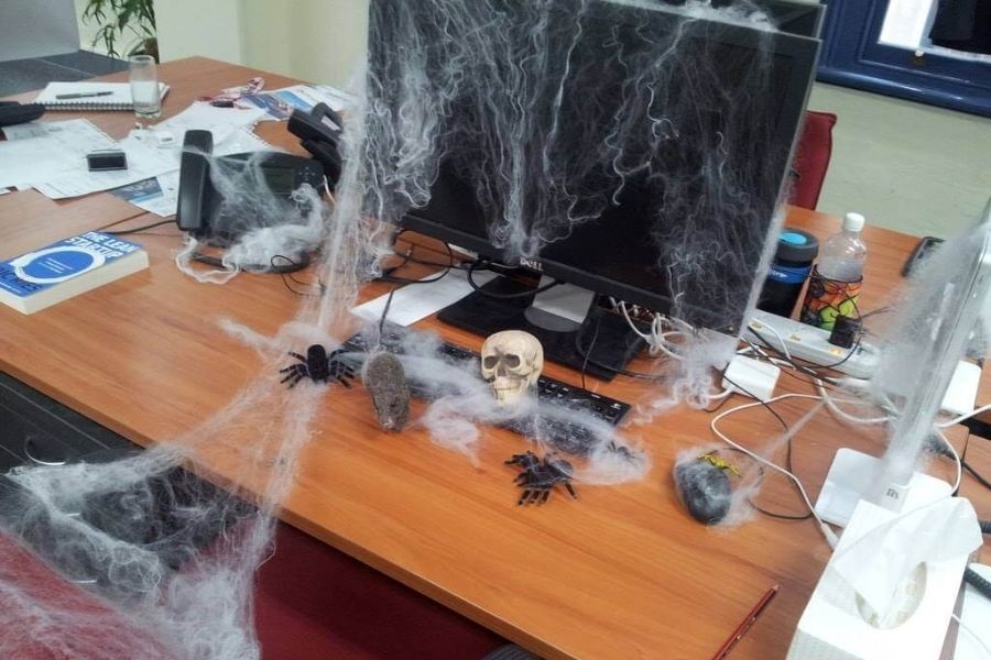 Nếu tài chính dư dả thì bạn có thể sắm những món decor chuyên nghiệp về tô điểm cho không gian làm việc. Cách trang trí văn phòng Halloween như thế này rất nhanh, gọn mà cũng cực kỳ chỉn chu, đẹp mắt.