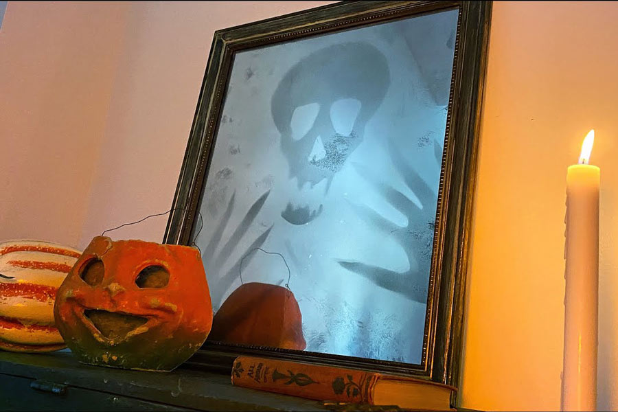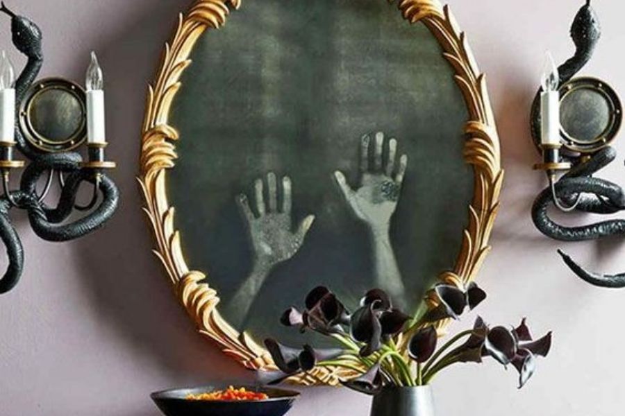 Nếu dư dả kinh phí thì bạn có thể mua gương ma quái từ các tiệm chuyên bán đồ trang trí. Còn nếu tự làm thì bạn nên dùng một tấm kính, dán hình ma hoặc dùng mực đỏ viết chữ lên thì cũng rất ấn tượng, ma mị.