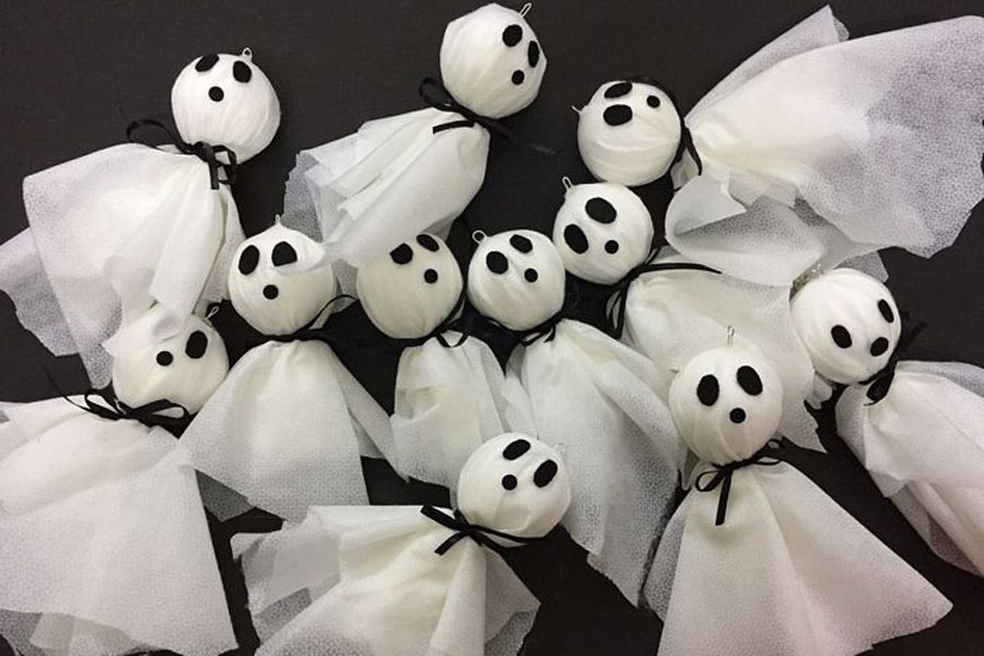 Đây là một ý tưởng sáng tạo mà bạn có thể áp dụng để trang trí Halloween cho văn phòng. Để thực hiện bạn chỉ cần chuẩn bị vật liệu như vải màu trắng hoặc đen, bông, đèn lồng,…