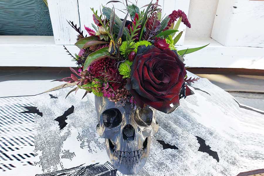 Hoa cho ngày Halloween cần thiết kế độc đáo, huyền bí, màu sắc thiên về đỏ, đen và cam. Bạn có thể trang trí thêm bằng những dây ruy băng đen, cắm vào bình đầu lâu hay nhấn nhá vài hình nộm ma quái nhỏ.