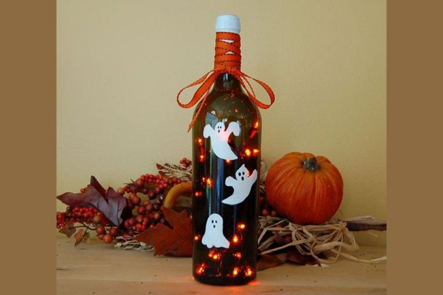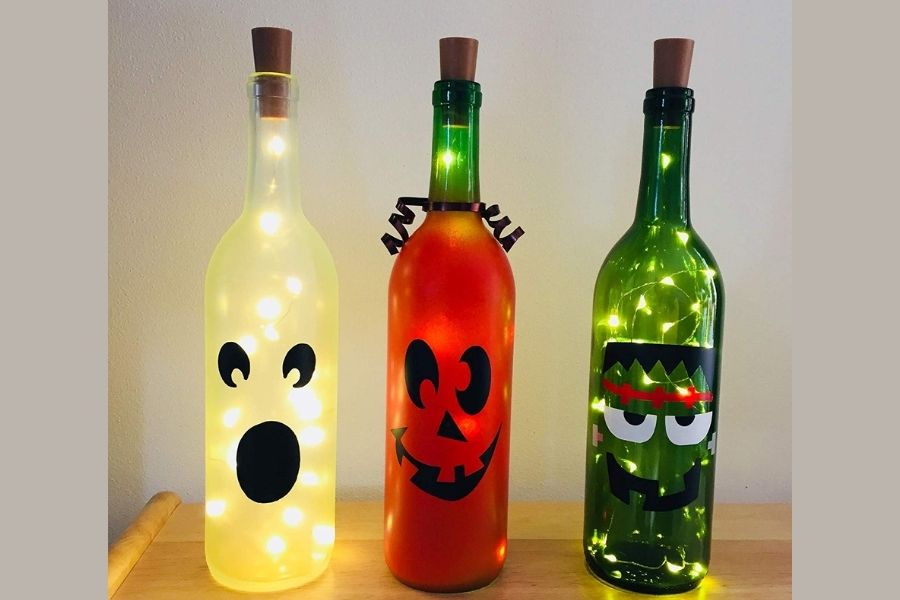 Với chai lọ thủy tinh, cách đơn giản nhất là sử dụng sơn, màu nước, giấy màu để tô vẽ bên ngoài. Hoặc đơn giản hơn là in những hình dán ma mị và dán lên thân chai. Bên cạnh đó, đừng quên đặt thêm những chiếc đèn ma mị vào trong chai để tăng thêm độ huyền ảo. Sau đó, hãy đặt chúng ở những nơi có ít ánh sáng để chúng trở nên nổi bật và lung linh hơn.