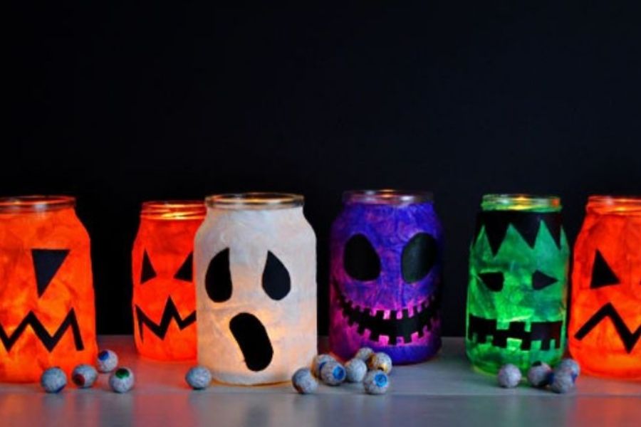 - Thắp nến hoặc bỏ dây đèn bên trong bình thủy tinh. Bên ngoài bọc lại bằng giấy màu mỏng rồi vẽ mặt quỷ lên.