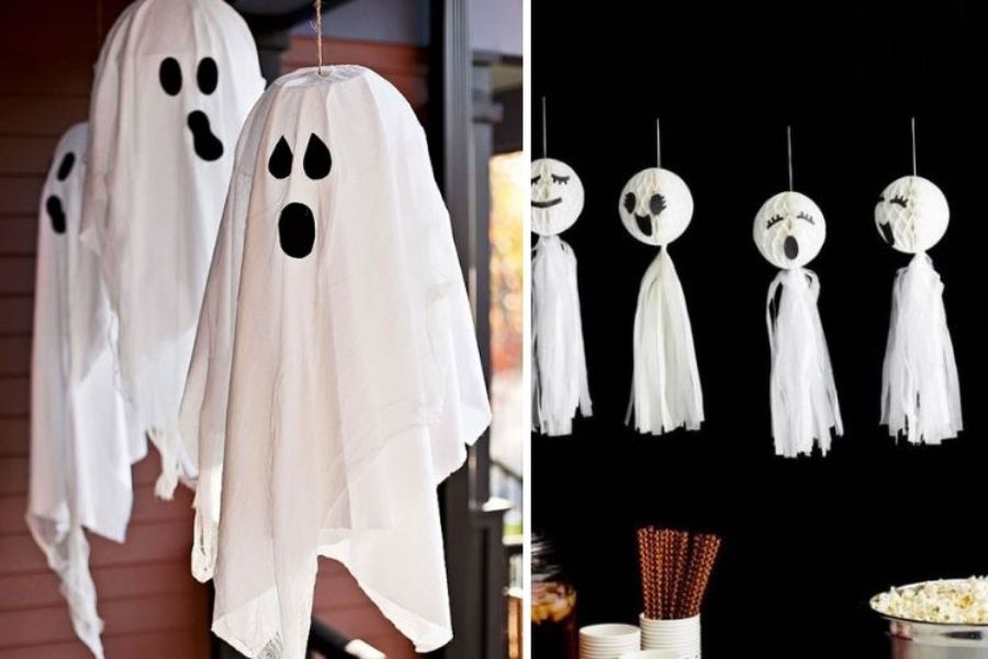 Khéo tay hơn một chút, các bạn có thể gấp giấy màu thành những chiếc lồng đèn bí ngô hay mũ phù thủy chỉ qua vài thao tác đơn giản. Ngoài ra, tận dụng giấy vệ sinh kết hợp cùng cúc áo và dây dù để tạo hình bóng ma cũng là một ý tưởng mới lạ và sáng tạo.