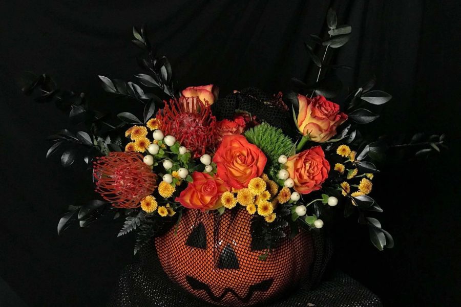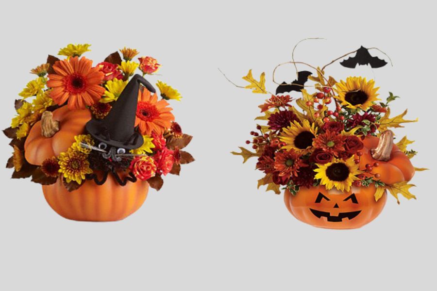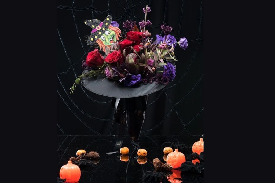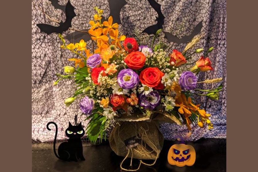 Bên cạnh những đồ vật trang trí nêu trên, bạn có thể điểm tô không gian bằng một vài lọ hoa quỷ ám để không khí thêm huyền bí. Bạn có thể đặt hoa bên trong một chiếc lọ hình bí ngô và kết hợp thêm một số hình nộm hình chú nhện hoặc đầu lâu trên bàn để tạo sự bắt mắt.