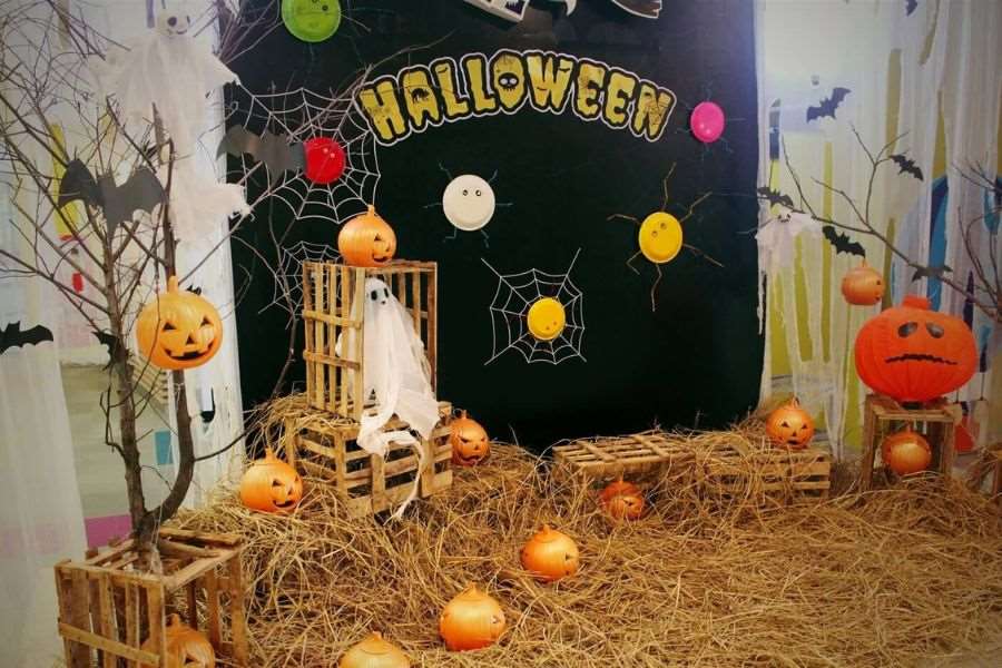 Bạn hãy tạo điểm nhấn bằng dòng chữ “Happy Halloween” và một số những hình ảnh kinh dị đặc trưng khác. Như vậy bạn đã có một góc check in thú vị để tận hưởng trọn vẹn không gian ngày lễ Halloween.