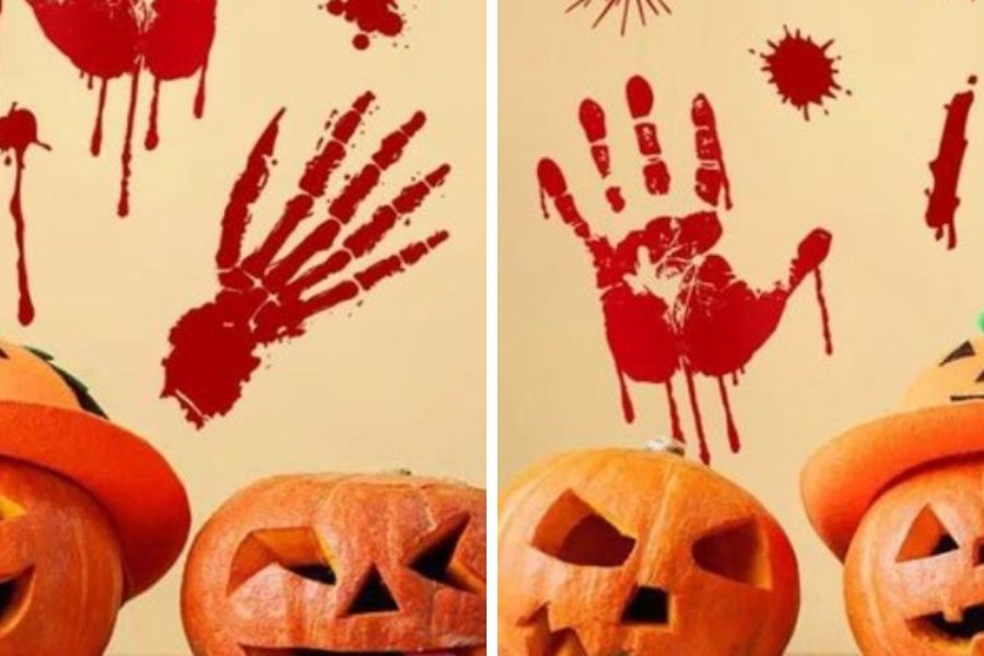 Cách decor ngày lễ Halloween đơn giản mà bạn có thể thực hiện theo là in hình bàn tay lên trên giấy, tường,… Bạn hãy sử dụng những màu sơn như đỏ, đen,… để in hình sẽ giúp tăng phần rùng rợn hơn cho không gian.