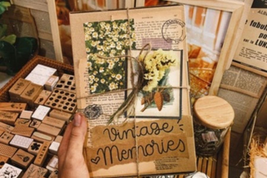Hay bạn muốn trang trí theo phong cách Vintage thì bạn cần những tờ giấy báo hoặc xi măng, một đoạn dây thừng loại nhỏ, một trái thông hay những sticker vintage.