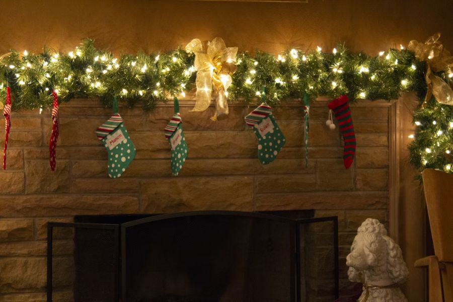 Đồ trang trí lò sưởi được sử dụng phổ biến như: Những chiếc tất ngộ nghĩnh hoặc chiếc vòng nguyệt quế.