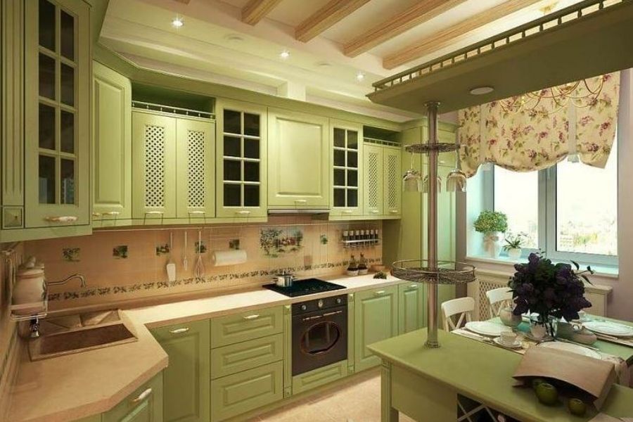 Màu sơn điển hình cho phong cách này là màu kem, xanh,… thể hiện được sự ngọt ngào. Nhà bếp kiểu này thường phù hợp với những gia đình yêu thích sự nhẹ nhàng, hoặc nữ sống độc thân mang tâm hồn thơ mộng, hướng nội.