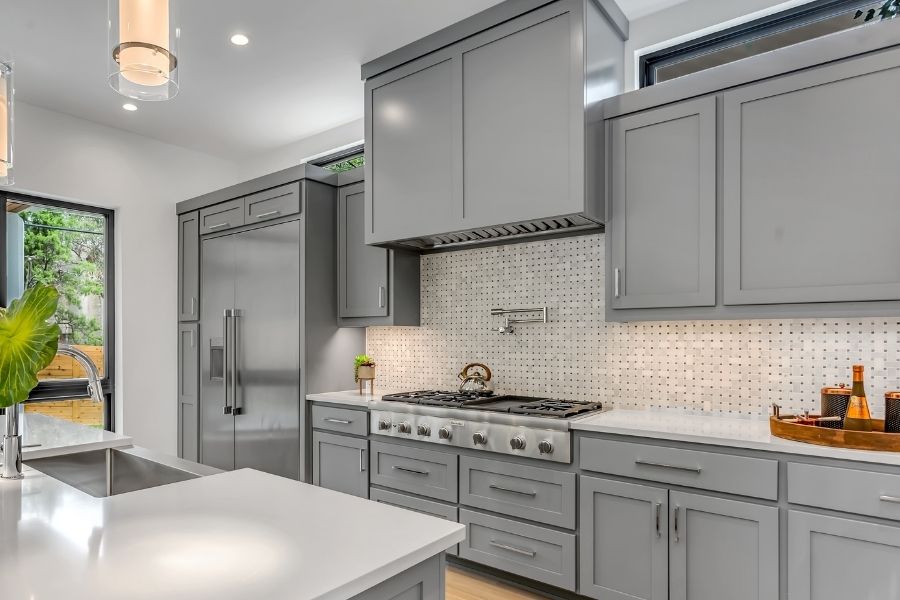 Kết hợp giữa gam màu trắng, pastel hoặc trung tính cùng với màu xám của chất liệu inox, kim loại trong nhà bếp mang đến vẻ đẹp châu Âu, rất hiện đại và cuốn hút.