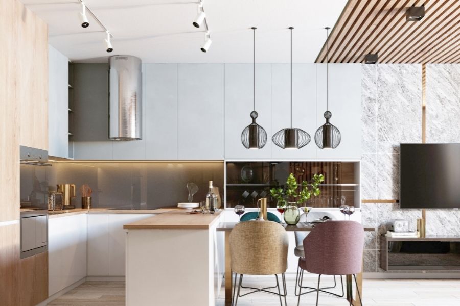 Ngoài ra, bạn có thể sử dụng thêm đèn trần để trang trí cho căn bếp thêm khang trang, hiện đại. Lựa chọn đèn trần có ánh sáng vàng dịu nhẹ sẽ rất lãng mạn và phù hợp để thư giãn mỗi bữa tối.