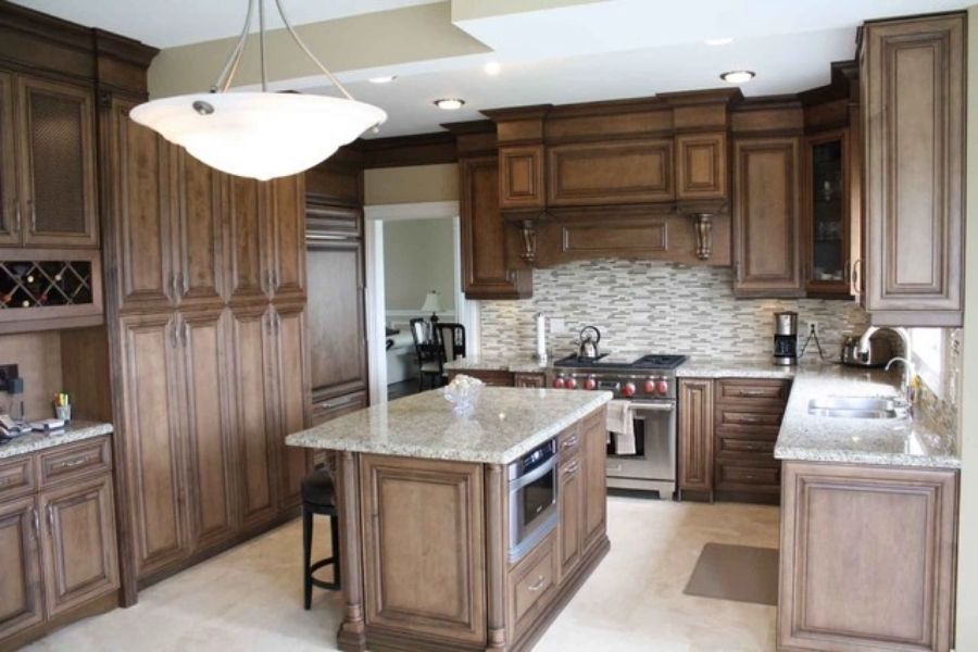 Phong cách cổ điển này rất phổ biến ở những gia đình tại Việt Nam. Sự kết hợp giữa vật liệu làm bằng gỗ và đá là điển hình của phong cách này. Đây là cách bố trí rất đơn giản nhưng mang lại sự tiện lợi và rất khang trang cho gian bếp.