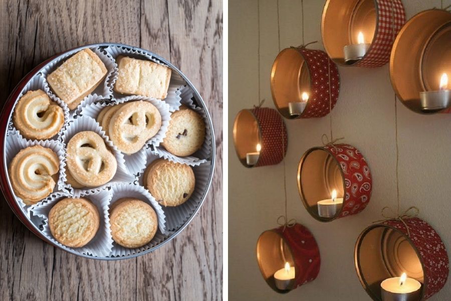 Cách làm mẫu trang trí này khá đơn giản, bạn đem những chiếc hộp bánh bằng hợp kim đi rửa và để ráo. Sau đó, sử dụng những tấm giấy màu hoặc giấy decal có màu sắc và họa tiết Noel để dán mặt ngoài hộp.