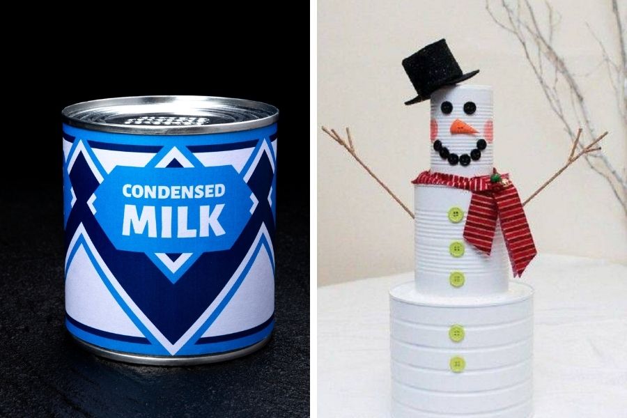 Tương tự như cách làm cây thông, bạn cũng có thể tạo ra một người tuyết đáng yêu từ 3 lon sữa xếp chồng lên nhau nhờ thay đổi cách trang trí.