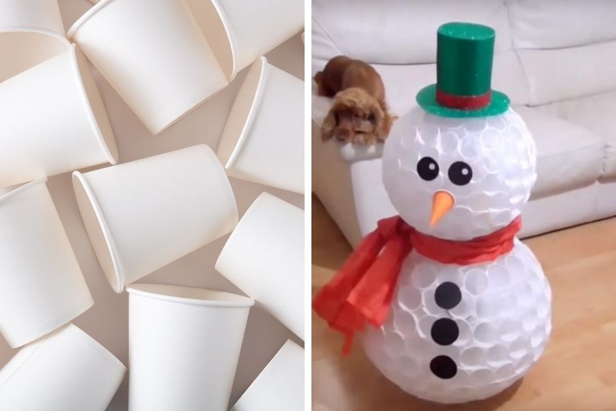 Những chiếc ly nhựa, ly giấy đã qua sử dụng có thể đem tái chế để tạo ra một chú người tuyết “siêu cấp” dễ thương.