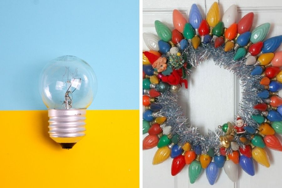 Với những chiếc bóng đèn bị cháy bạn hoàn toàn có thể tận dụng để làm vật trang trí cây thông Noel cho dịp Giáng Sinh này. Bạn lần lượt xỏ từng chiếc bóng đèn vào dây để tạo thành một vòng hoa sặc sỡ.