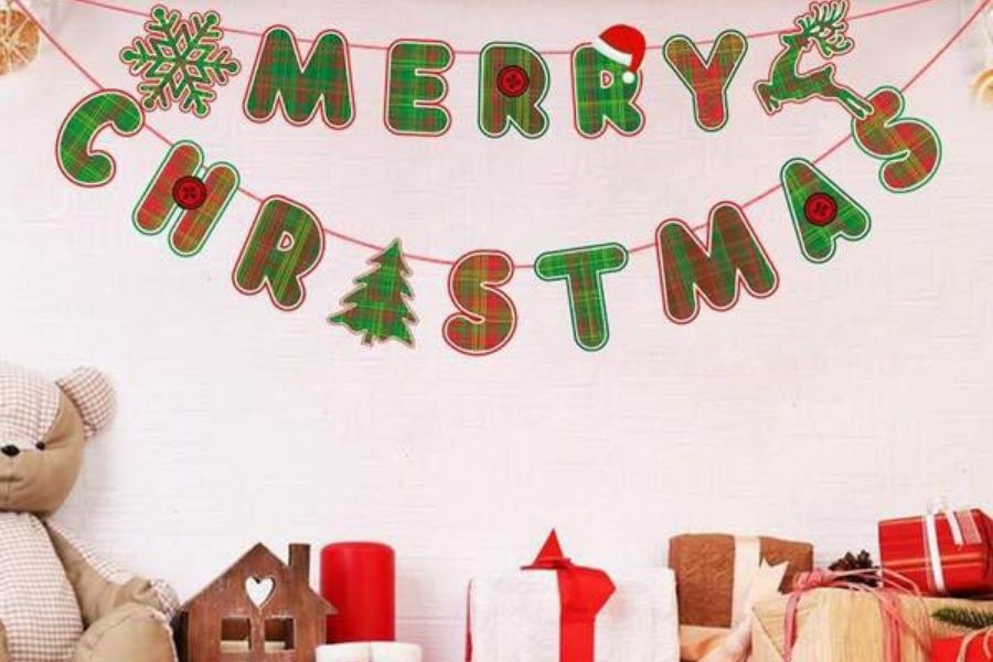 Bạn có thể tham khảo các dòng chữ như: Merry Christmas, Giáng Sinh vui vẻ… nên kết hợp tông đỏ và xanh lá cây của mùa Noel để hợp concept hơn.