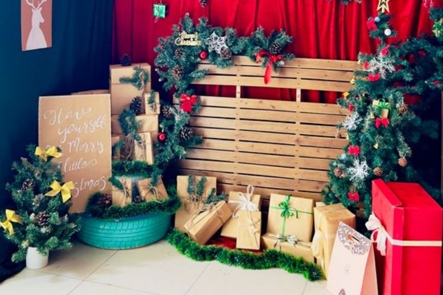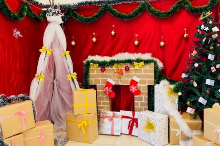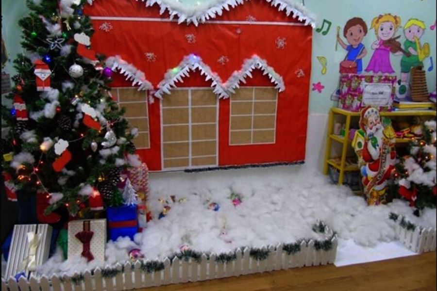 - Xung quanh góc lớp, trang trí bằng những quả thông nhỏ, hộp quà màu sắc và hàng rào trắng tinh khôi. Các chi tiết nhỏ này sẽ tạo ra không gian pha trộn giữa vui nhộn và truyền thống.