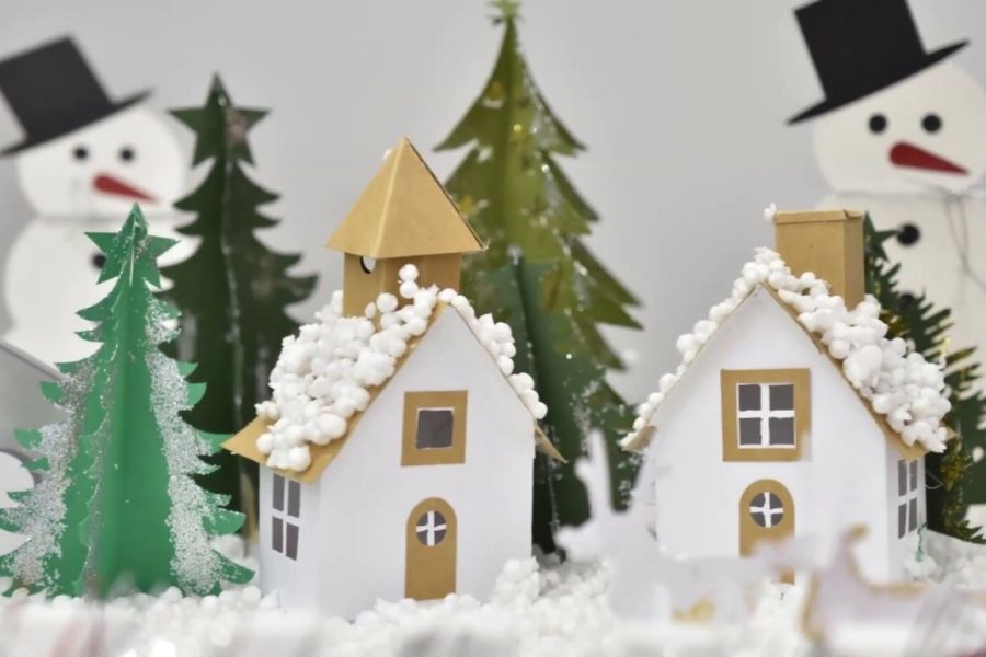 Bạn chỉ cần tận dụng những vật liệu như giấy bìa màu, vải,… để Trang trí Noel mầm non đơn giản. Nhưng để bắt mắt hơn, bạn có thể dùng giấy nhiều màu để cắt và dán thành những tòa tháp, những hàng rào nhỏ bé xinh xắn và rải thêm bông gòn.