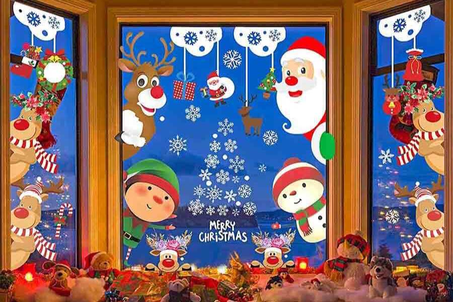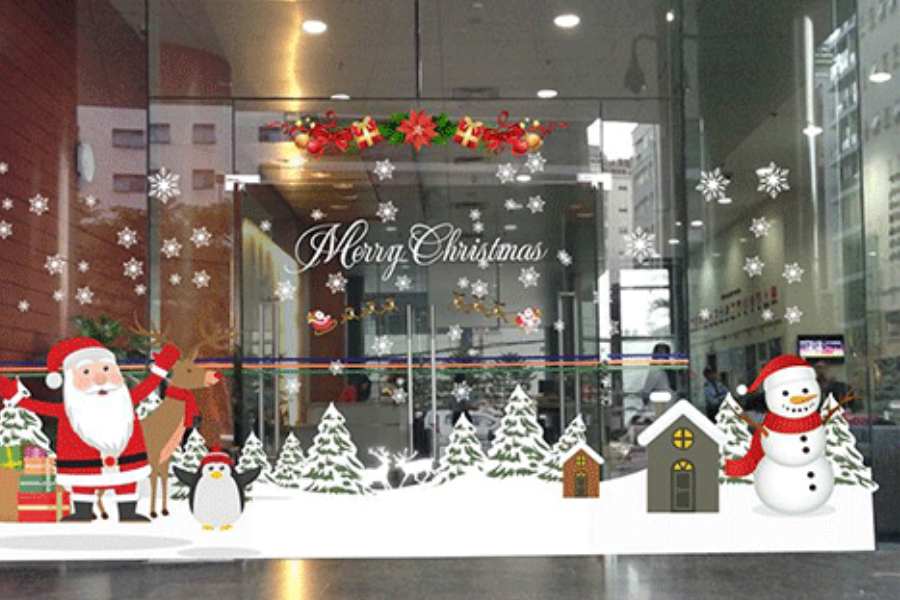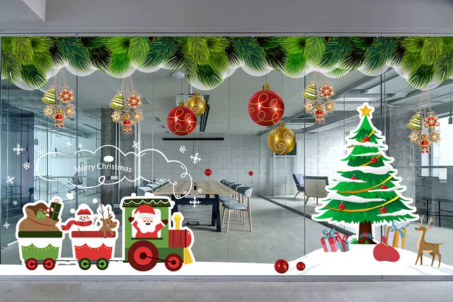 Hiện nay, nhiều cơ quan thường dán sticker hoặc giấy decal lên cửa kính để trang trí Noel cho văn phòng. Bạn có thể kết hợp với nhiều hình dán khác nhau như: Ông Noel, trái châu, tuần lộc,… và treo thêm một vài dây kim tuyến vào các cạnh cửa. Đây là cách trang trí Noel được nhiều người lựa chọn bởi sự đơn giản, nhanh chóng và dễ dàng tháo/gỡ.