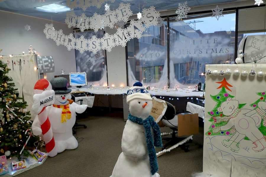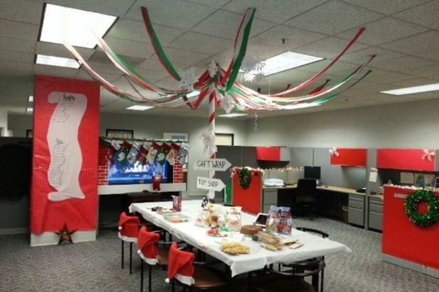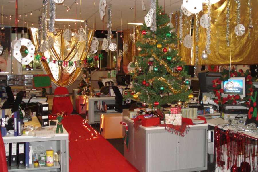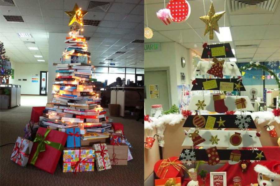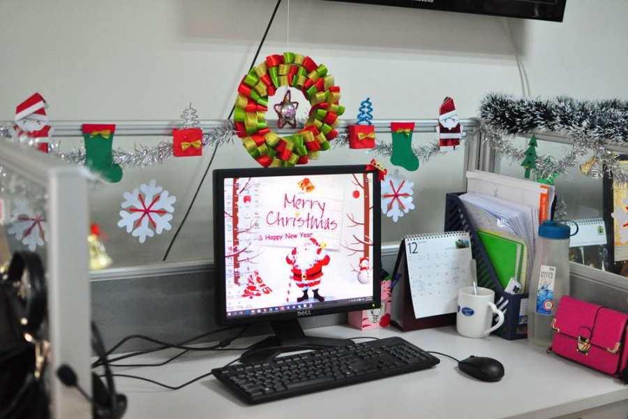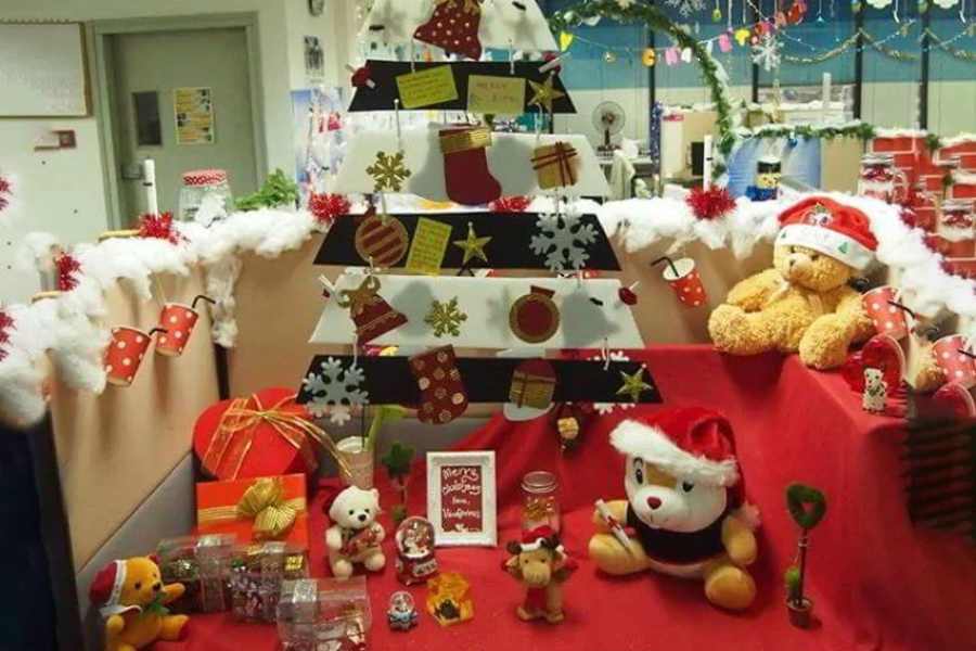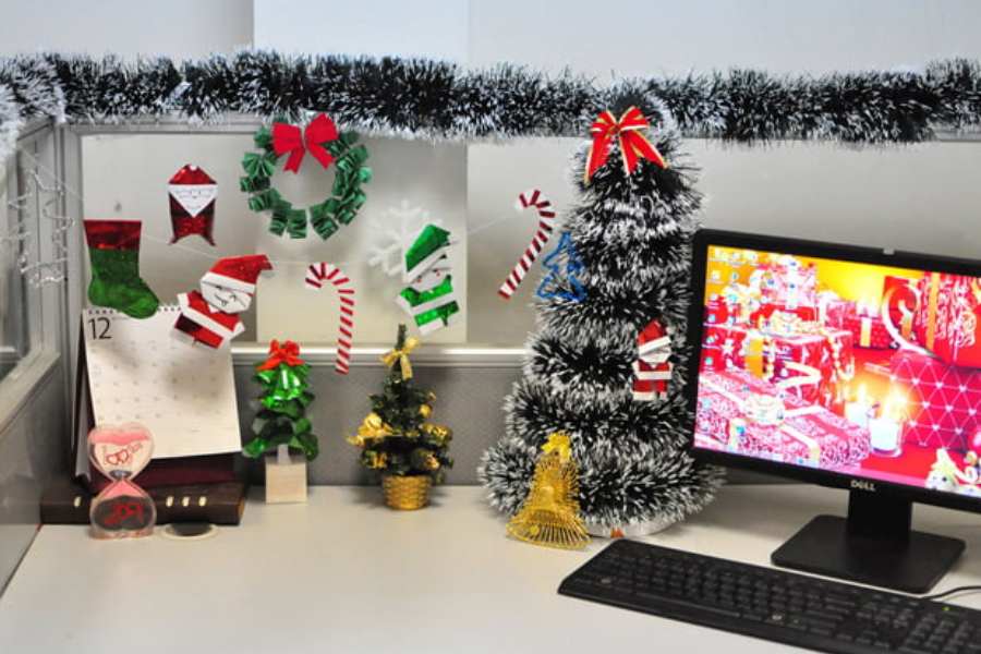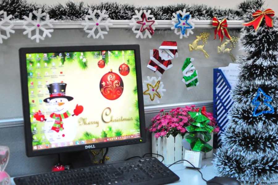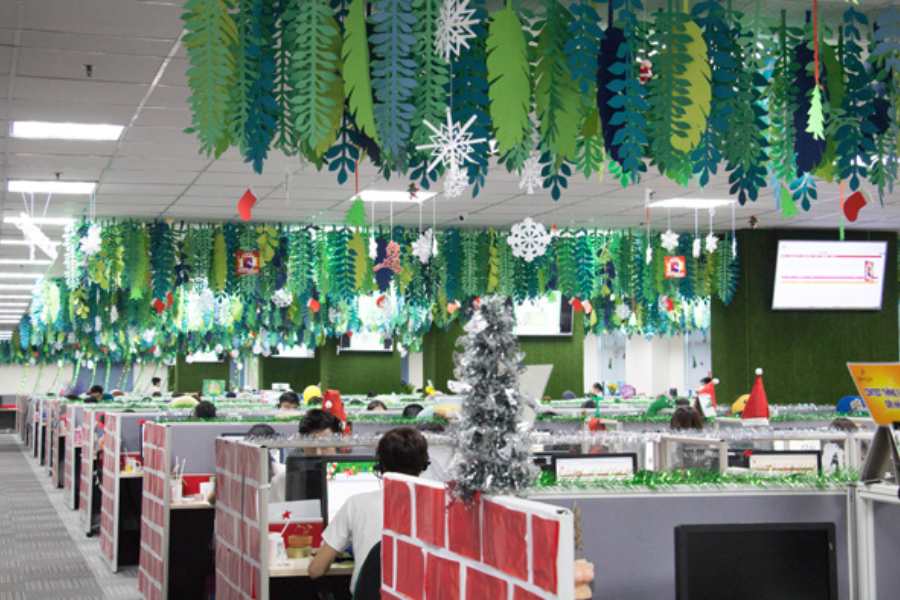 Cây thông handmade từ những chiếc hoa giấy vô cùng độc đáo.Ý tưởng trang trí Noel cho văn phòng với băng rôn và mô hình người tuyết sống động. Ý tưởng trang trí góc làm việc trong văn phòng với những sợi dây ruy băng lấp lánh và nhiều dây treo đẹp mắt.Ý tưởng sử dụng dây trang trí màu xanh chủ đạo trong mỗi dãy bàn tại văn phòng vào ngày Noel.Văn phòng được trang trí nhiều dây treo kim tuyến cùng cây thông mang đậm dấu ấn Noel.