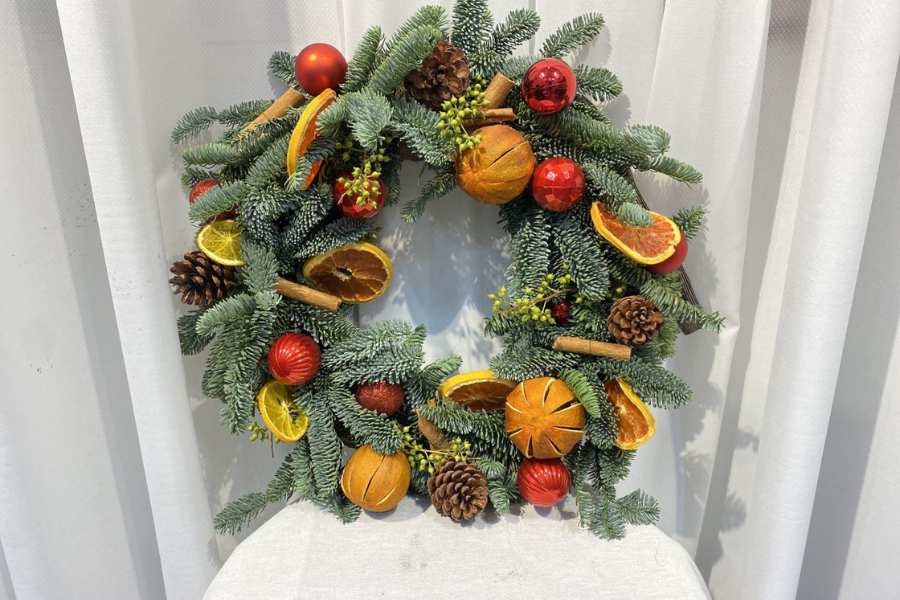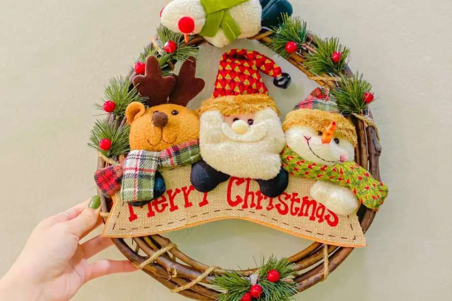 Vòng nguyệt quế được liệt kê vào danh sách những phụ kiện không thể thiếu khi trang trí Giáng Sinh văn phòng. Bạn có thể tự làm bằng cách dùng lá thông hoặc lá màu xanh cuộn lại, sau đó trang trí thêm các phụ kiện như: Trái châu, ông Noel, tất, đèn led… để chiếc vòng đẹp mắt hơn.