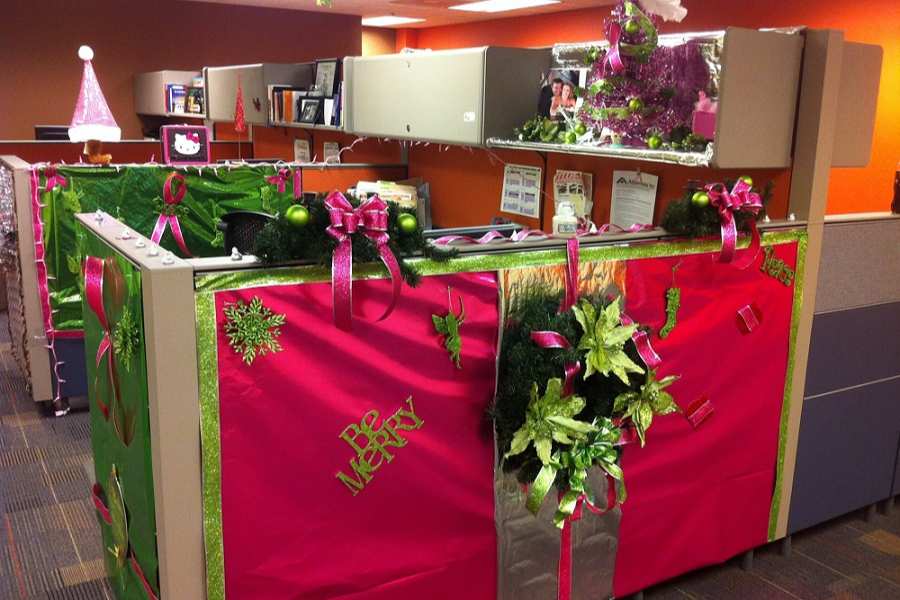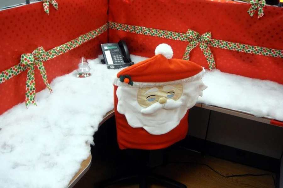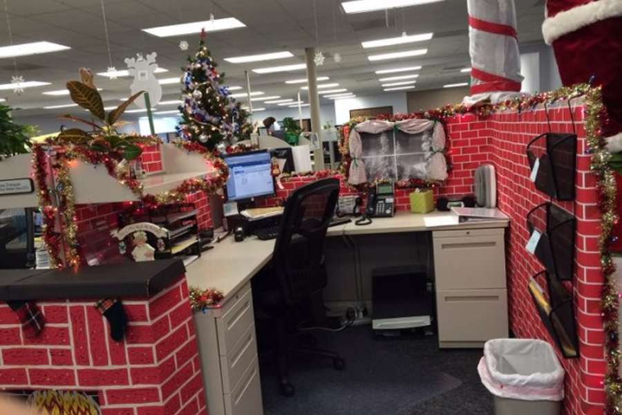 Ý tưởng trang trí Noel cho văn phòng bằng những mảnh giấy dán màu đỏ tựa như những viên gạch đầy sáng tạo.Sử dụng những mảnh giấy dán tường màu đỏ để trang trí khu vực bàn làm việc để mang không khí Noel về văn phòng.Ý tưởng trang trí bàn làm việc với giấy dán màu đỏ cùng ruy băng và vỏ bọc ghế hình ông Noel đầy sáng tạo.Bạn có thể dùng giấy dán màu đỏ để trang trí lên các mảng tường trống và bày trí thêm một số phụ kiện để văn phòng thêm lung linh.Trang trí không gian làm việc với nhiều giấy dán đa sắc màu, ruy băng và vòng nguyệt quế xinh xắn.