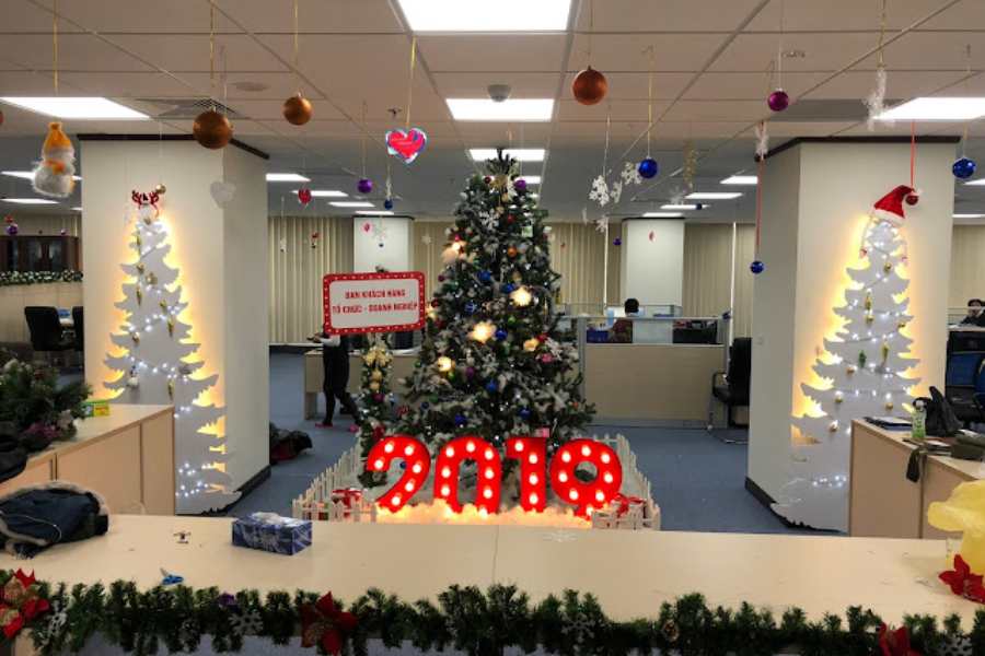 Trang trí cây thông Noel cho văn phòng mang đến không khí vui vẻ và ấm áp khi làm việc.Mẫu trang trí cây thông Noel tại văn phòng kết hợp cùng những dây kim tuyến và trái châu lấp lánh.Bạn có thể đặt thêm một vài hộp quà trang trí bên dưới cây thông Noel để văn phòng thêm nổi bật.Mẫu cây thông trang trí Noel đơn giản dành cho văn phòng với những trái châu màu trắng sang trọng.Mẫu cây thông trang trí Noel truyền thống với những phụ kiện quen thuộc như: Trái châu, tuần lộc,…