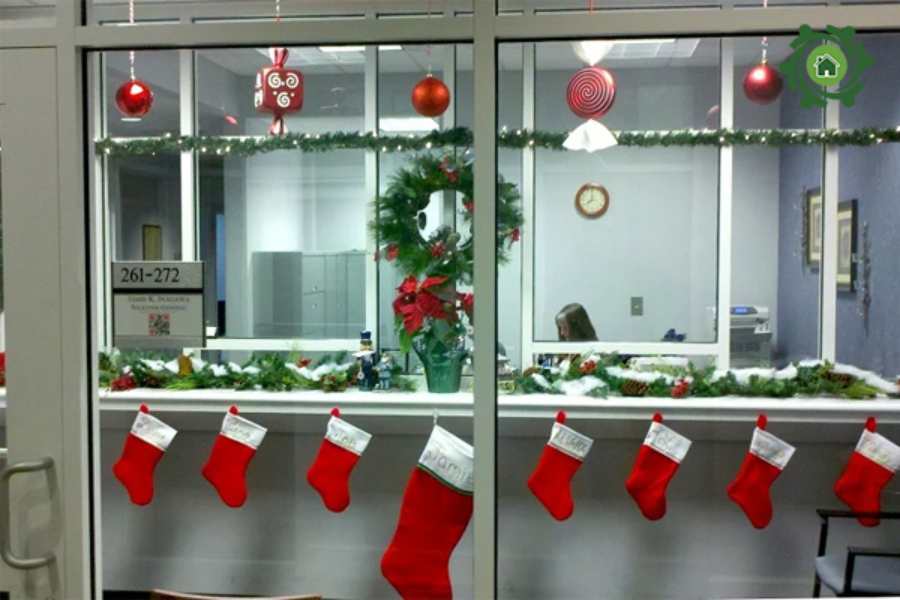 Sử dụng những chiếc tất Noel cũng là một trong những cách trang trí Giáng Sinh cho văn phòng được nhiều người lựa chọn. Bạn có thể dùng những chiếc tất có gam màu đặc trưng của Noel (màu đỏ, xanh,…) và treo chúng lên khu vực lò sưởi, góc tường, cây thông hoặc trước cửa văn phòng để làm điểm nhấn.