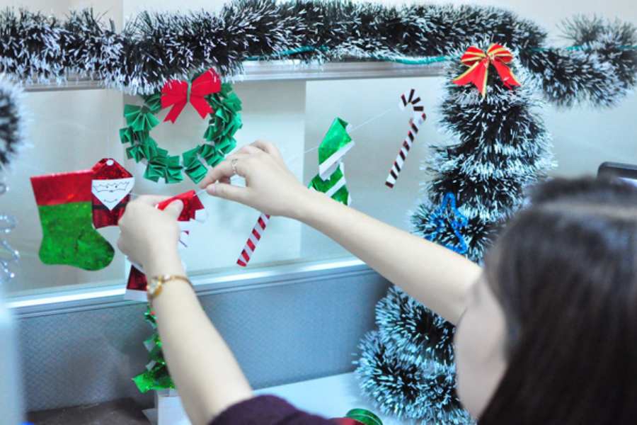 Trang trí Noel văn phòng bằng hoa giấy, băng rôn