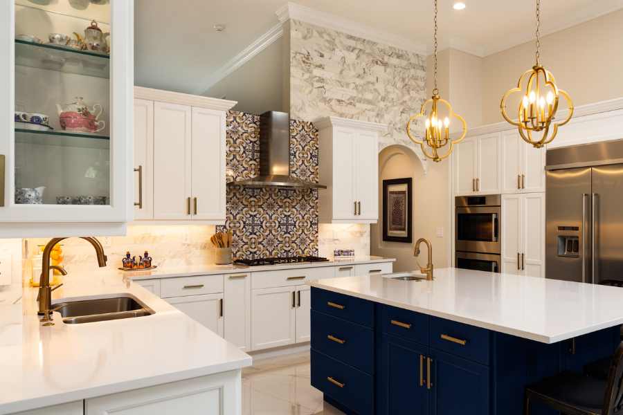 Nếu bạn đang muốn decor căn bếp đẹp theo cách sang chảnh thì bạn nên chọn trang trí theo tông trắng đơn giản. Sau đó lựa chọn những các đồ dùng tủ theo màu vân đá kết hợp với màu vàng đồng sẽ làm cho phòng ăn của bạn trông đẹp hơn.
