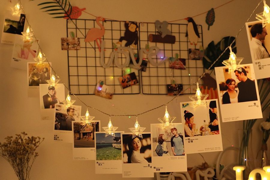 Ngoài ra, bạn có thể vắt chéo dây trên khung ảnh tùy theo sở thích, sau đó lấy ảnh và kẹp gỗ để cố định ảnh trên dây.