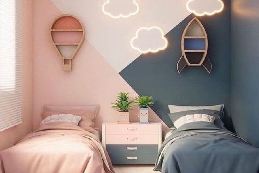 Phối hợp các sở thích và nhu cầu của hai đứa trẻ đôi khi có thể là một thách thức cho cha mẹ do tính cách khác nhau của chúng. Việc chia đôi căn phòng và thiết kế hai chiếc giường đôi có thể là điều kiện tốt để các cô gái thể hiện cá tính của mình.