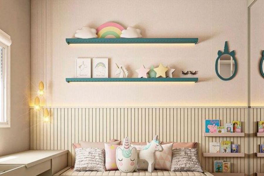 Các cô gái thường có rất nhiều thứ họ muốn lưu trữ và muốn giữ cho riêng mình trong căn phòng ngủ. Vì vậy, cha mẹ nên tạo nhiều không gian cất giữ hoặc trưng bày cho bé gái.