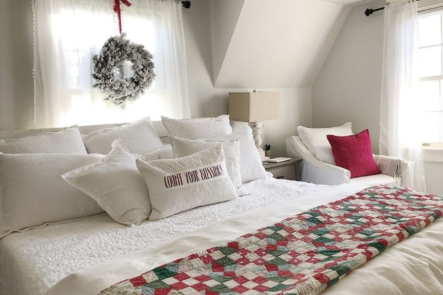 Ngoài ra, có thể sử dụng những tấm màn cửa mang màu sắc của Giáng Sinh như đỏ, xanh lá và trắng. Điều này sẽ mang lại không khí Noel ngập tràn căn phòng ngủ của bạn đấy!