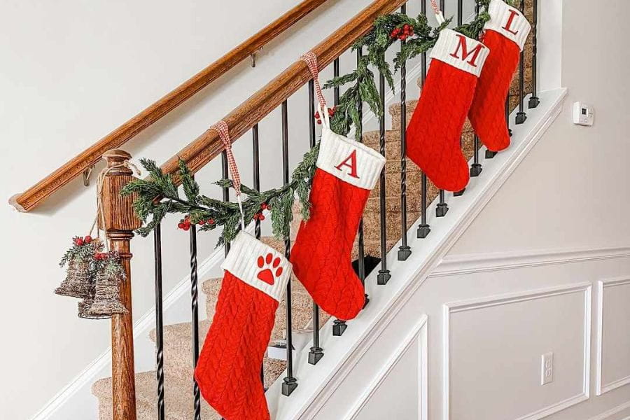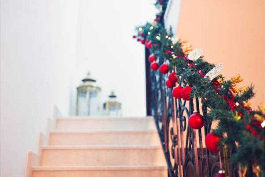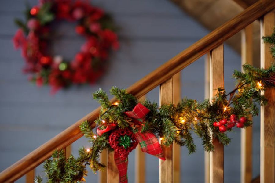Bạn có thể trang trí dọc theo thành cầu thang bằng các dãy dây lá thông kết hợp với nơ và dây đèn có ánh sáng lấp lánh để ngôi nhà của bạn trở nên ấm áp, mang đậm không khí Giáng Sinh.