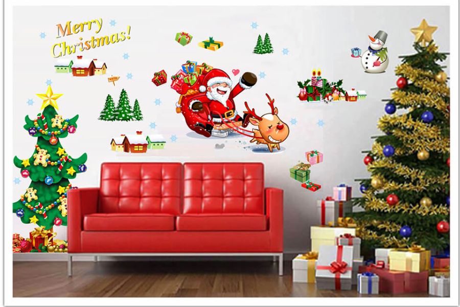 Bạn có thể lựa chọn trang trí cửa kính và tường bằng hình ảnh Ông già Noel, hộp quà hay các cành thông,… Hình ảnh decal trang trí khá đa dạng. Do đó, bạn có thể lựa chọn tùy vào sở thích của mình.