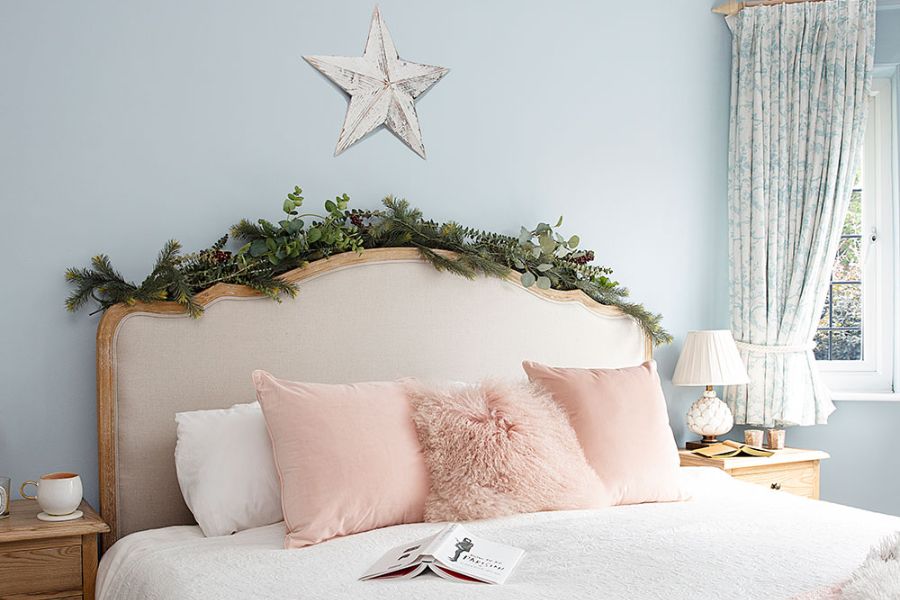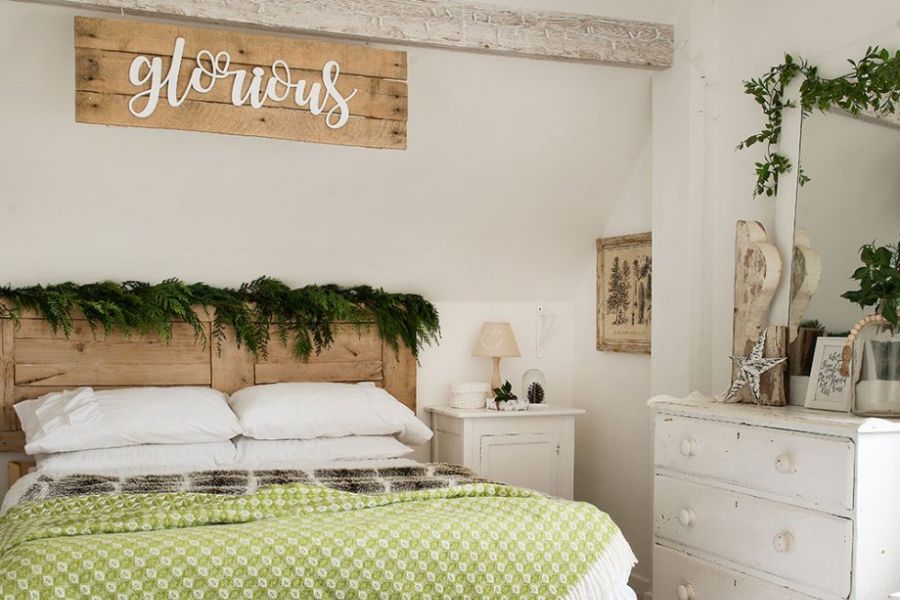 Một vị trí lý tưởng để trang trí Noel cho phòng ngủ chính là đầu giường. Không cần những món đồ trang trí Noel quá cầu kỳ và phức tạp, một vài điểm nhấn như chiếc vòng lá mùa vọng, những hình ngôi sao, hay bông tuyết,…treo ở trung tâm, cũng đã khiến cho căn phòng thêm nổi bật.