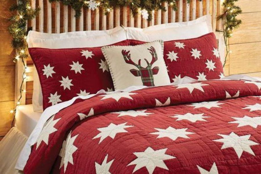 Màu đỏ, trắng và xanh lá cây là 3 màu truyền thống của mùa Giáng sinh. Do đó, thay đổi màu sắc của ga giường, chăn nệm theo những màu sắc trên cũng sẽ khiến cho căn phòng thêm sặc sỡ, góp phần tạo nên không khí Giáng sinh vui mắt và thú vị đấy.