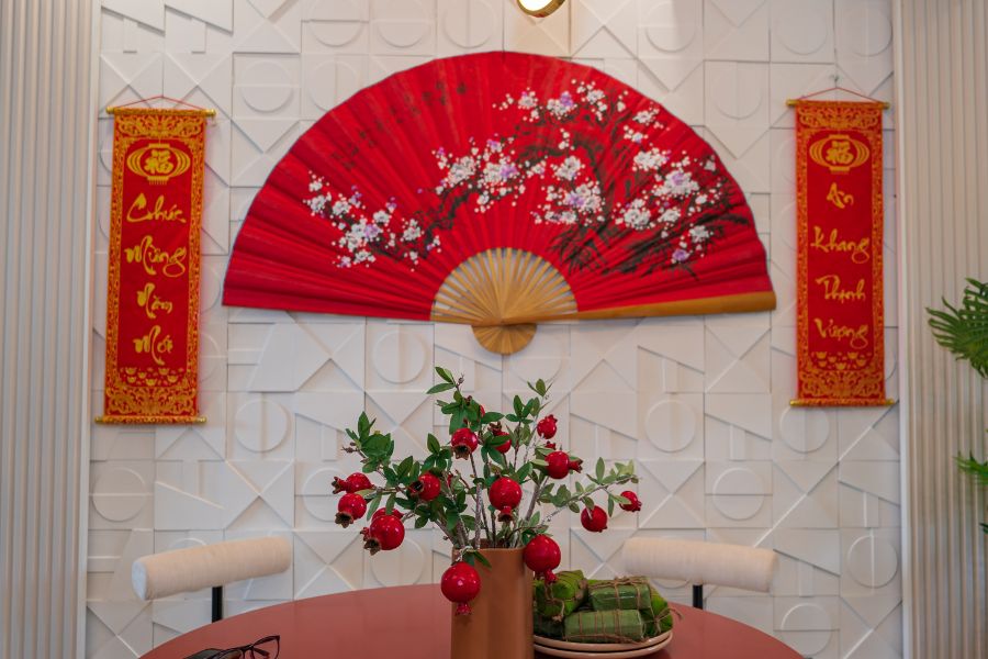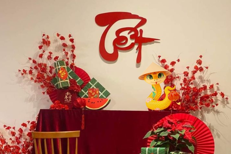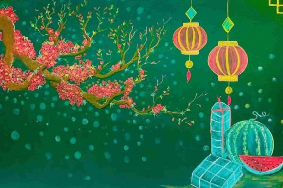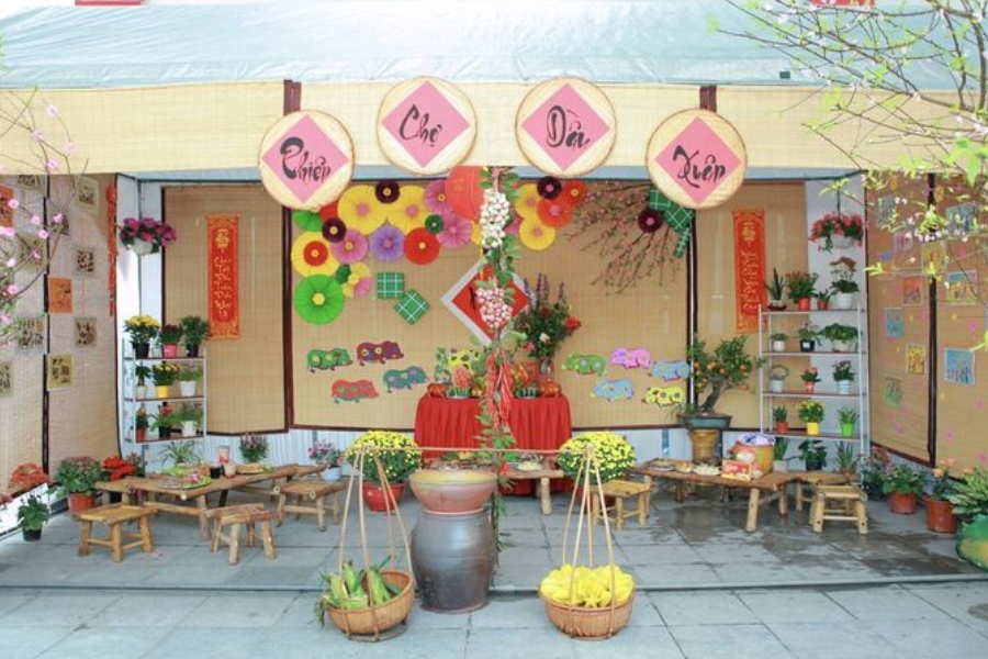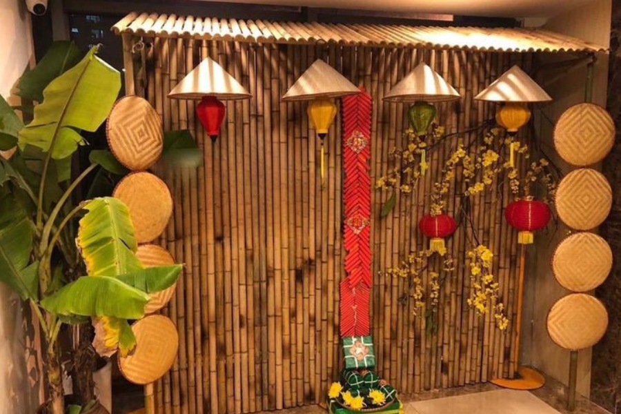 - Trang trí thêm câu đối, đèn lồng, bánh chưng, bánh tét làm điểm nhấn.