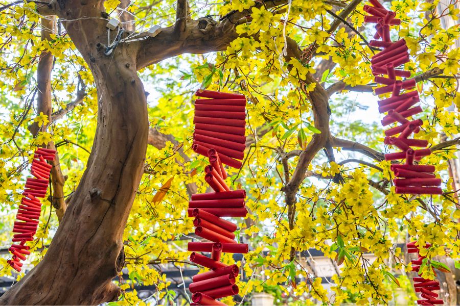 - Treo pháo giấy dọc hai bên cửa hoặc trên cây mai vàng.