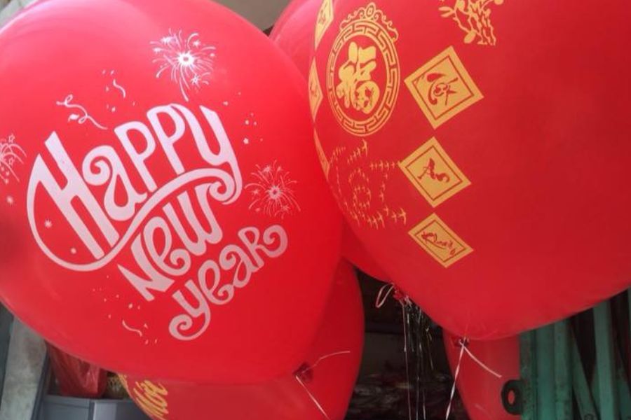 - Chọn bóng bay màu đỏ, vàng, in hình hoa mai, hoa đào hoặc câu chúc Tết.