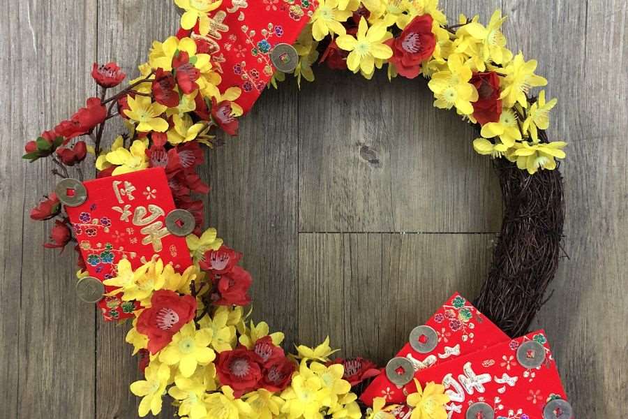 Vòng hoa tết cũng là ý tưởng thú vị mỗi khi decor tết ngoài trời. Những vòng hoa tết sẽ được tuỳ tay bạn chọn hoa hoặc mua sẵn ở ngoài, tuy có vẻ giản dị nhưng chúng sẽ là điểm nhấn đặc sắc cho dịp tết.