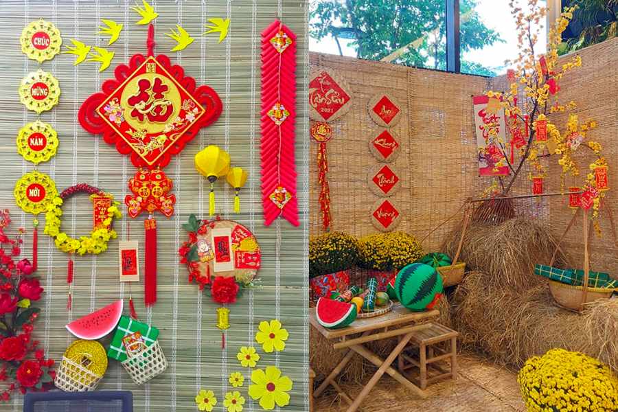 Sử dụng rơm rạ để lót nền, mô hình giỏ hoa được bố trí xung quanh. Bạn kết hợp thêm lồng đèn, cành mai, pháo, câu đối để treo lên mành tre.